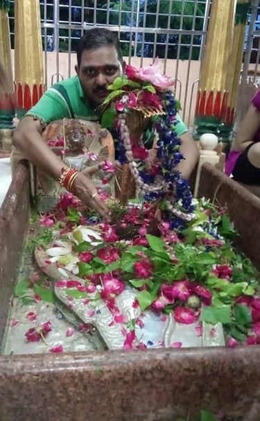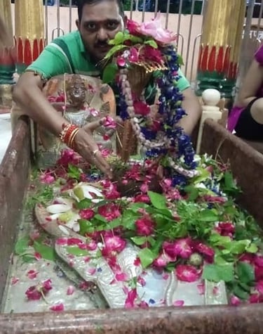 मंदिर प्रांगण में फूल सेवा और प्रसाद वितरण के दौरान हमारी टीम की सेवा गतिविधियाँ।